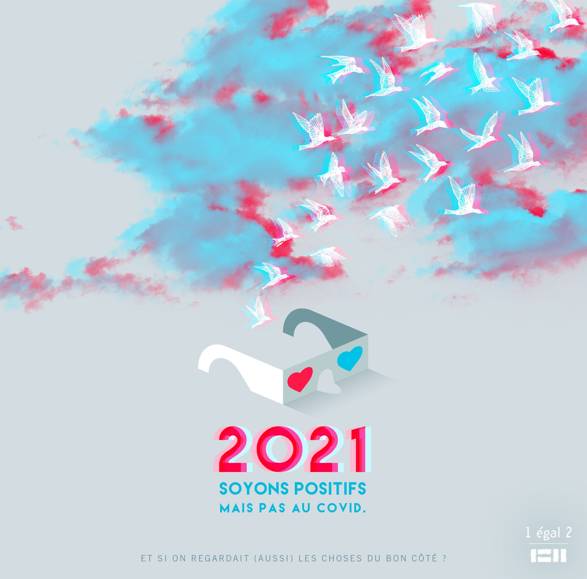 Vœux 2021 de l'agence 1=2 Soyons positifs, mais pas au COVID. Toute notre équipe vous souhaite la moitié pleine du verre.