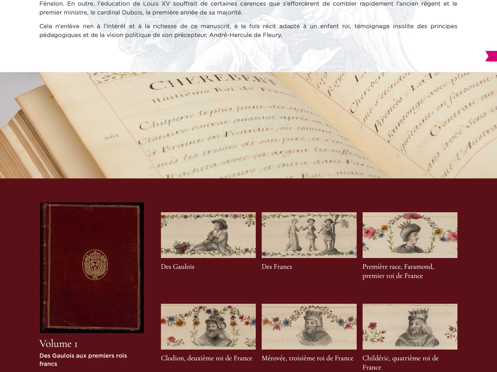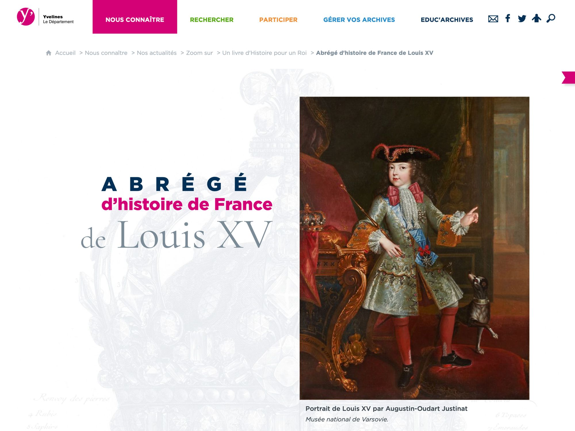 Le tricentenaire du couronnement de Louis XV et du retour de la cour à Versailles offre l’occasion de présenter un des fleurons de nos collections, L’abrégé de l’histoire de France, ensemble de recueils écrits au jeune roi à la demande d’André-Hercule de Fleury, son précepteur.