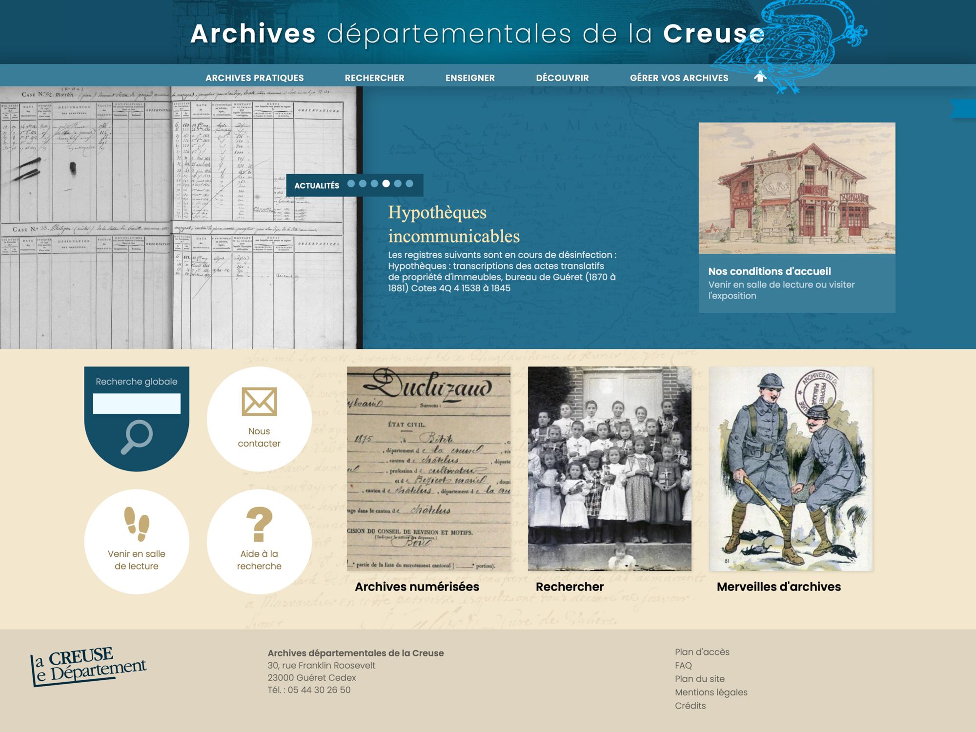 Notre site Internet, ouvert en 2012, s’est largement enrichi depuis. Aux grandes collections généalogiques et aux plans napoléoniens ont été progressivement ajoutés d’autres fonds (iconothèque, répertoires de notaires…), des pages à l’attention des producteurs d’archives et plus de 500 instruments de recherche. À partir de 2016, des campagnes de numérisation sont prévues concernant les registres de délibérations des 260 communes de la Creuse ainsi que d’autres typologies (terriers, procès-verbaux d’estimation des biens des émigrés, travaux sur les églises…).