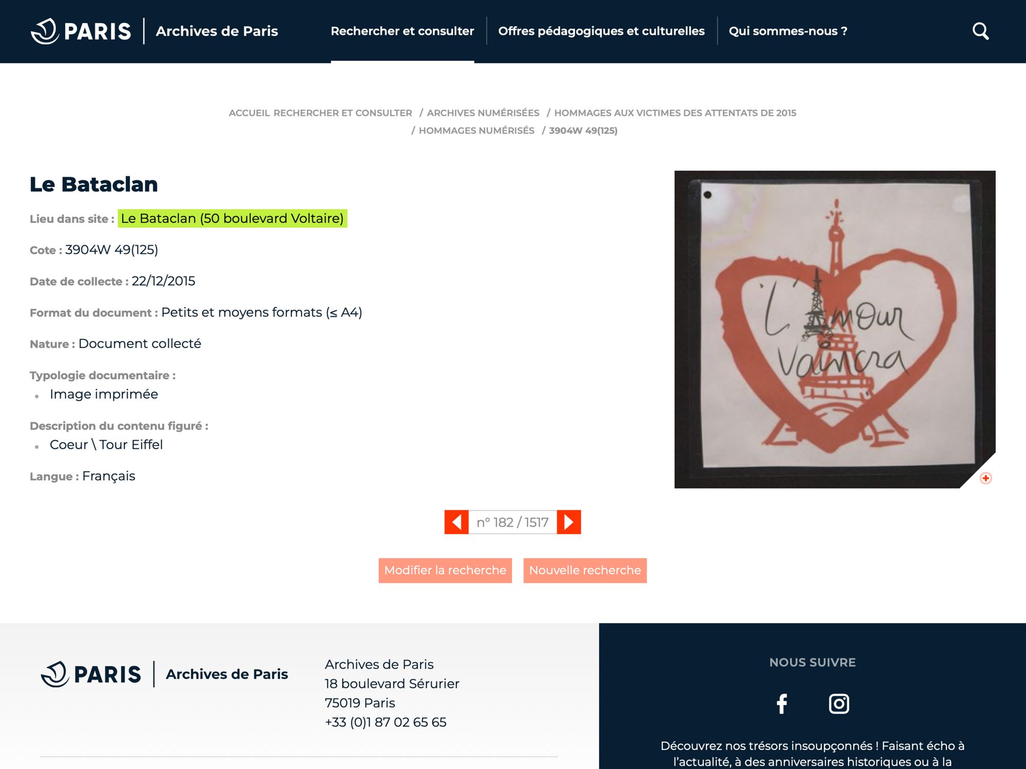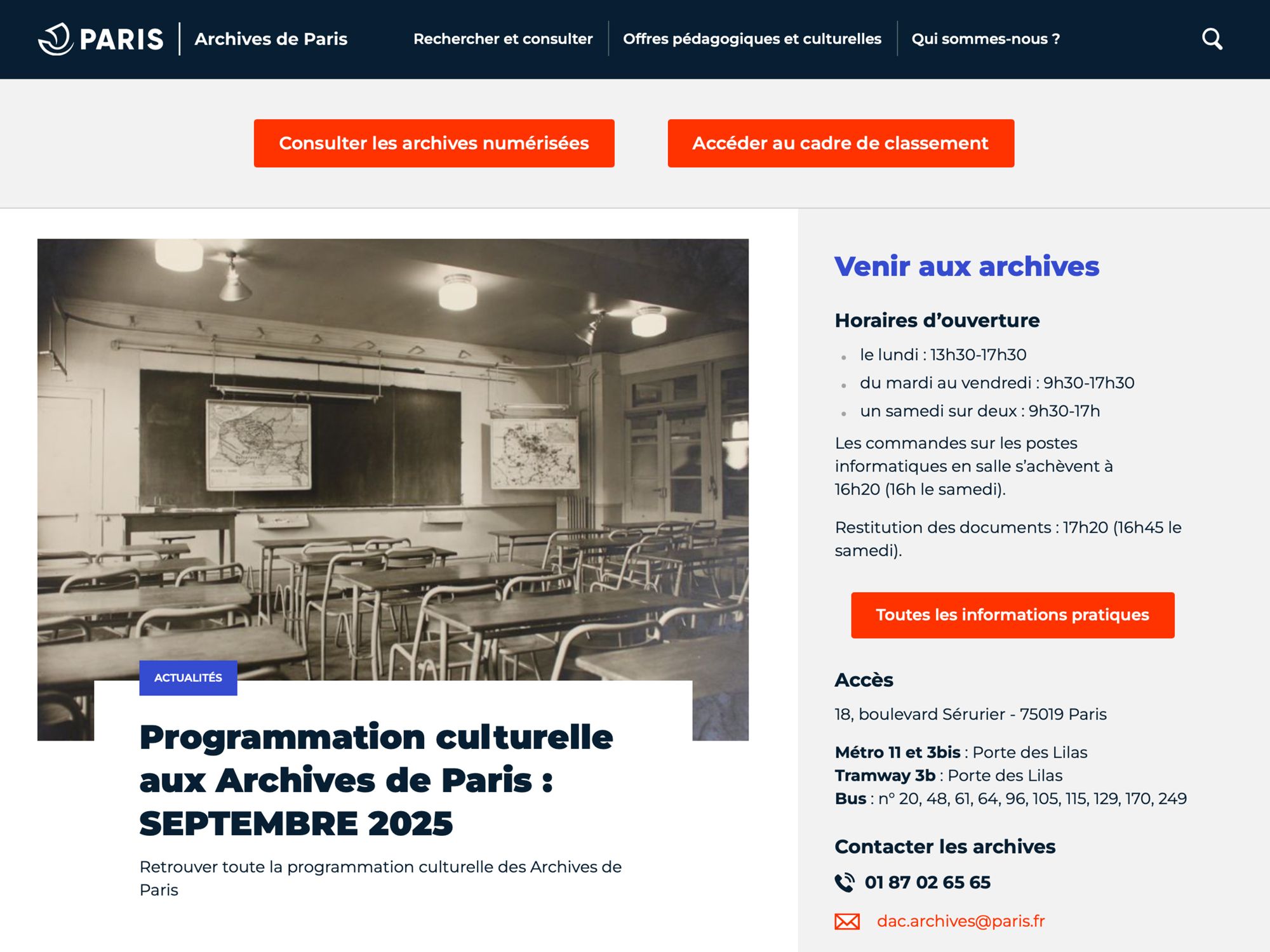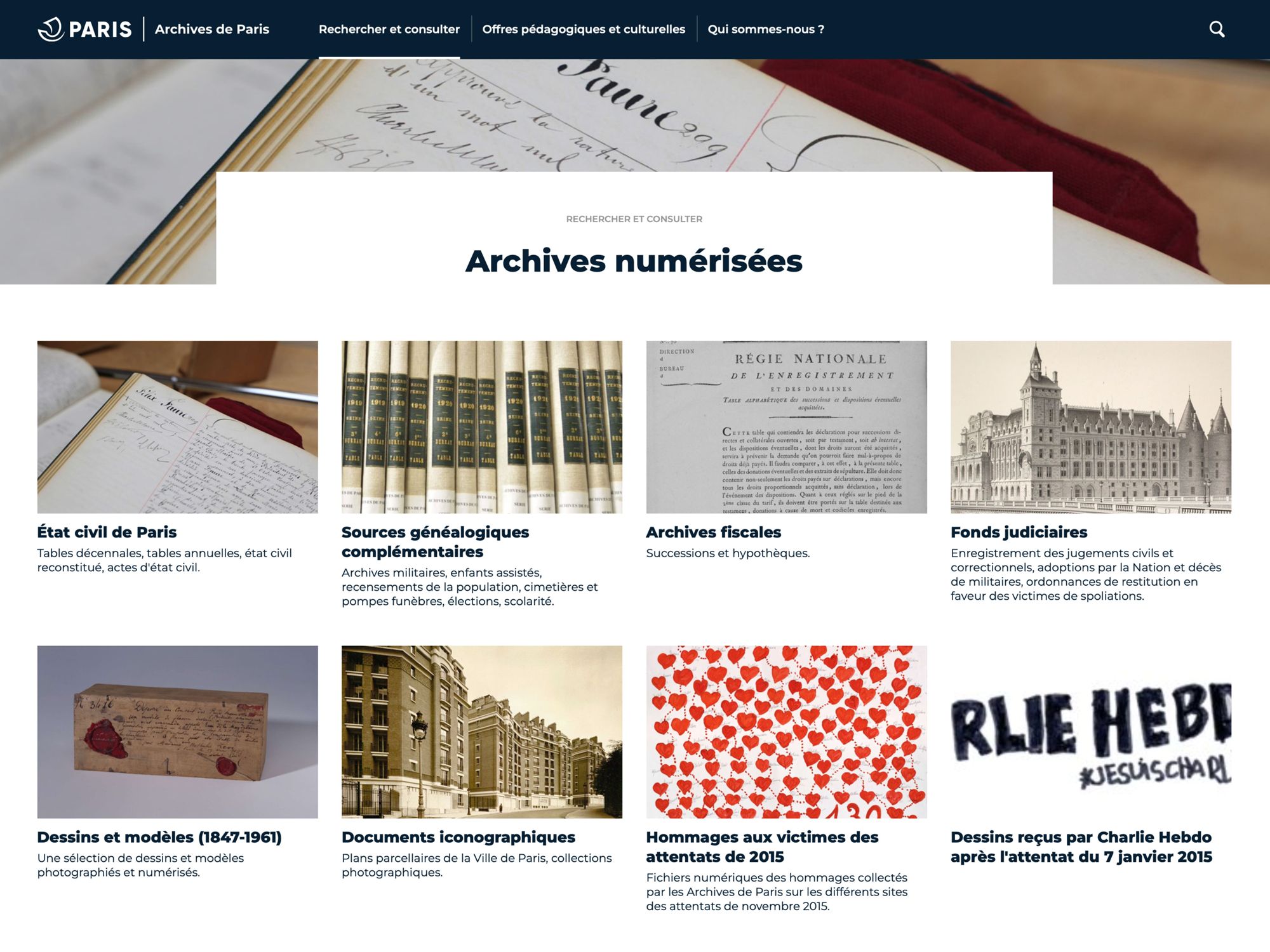 Les Archives de Paris mettent à disposition du public plus de 5,5 millions d'archives numérisées, ainsi que le fonds des hommages aux victimes des attentats de 2015. Le site, consulté par plus de 600 000 internautes chaque année, propose :