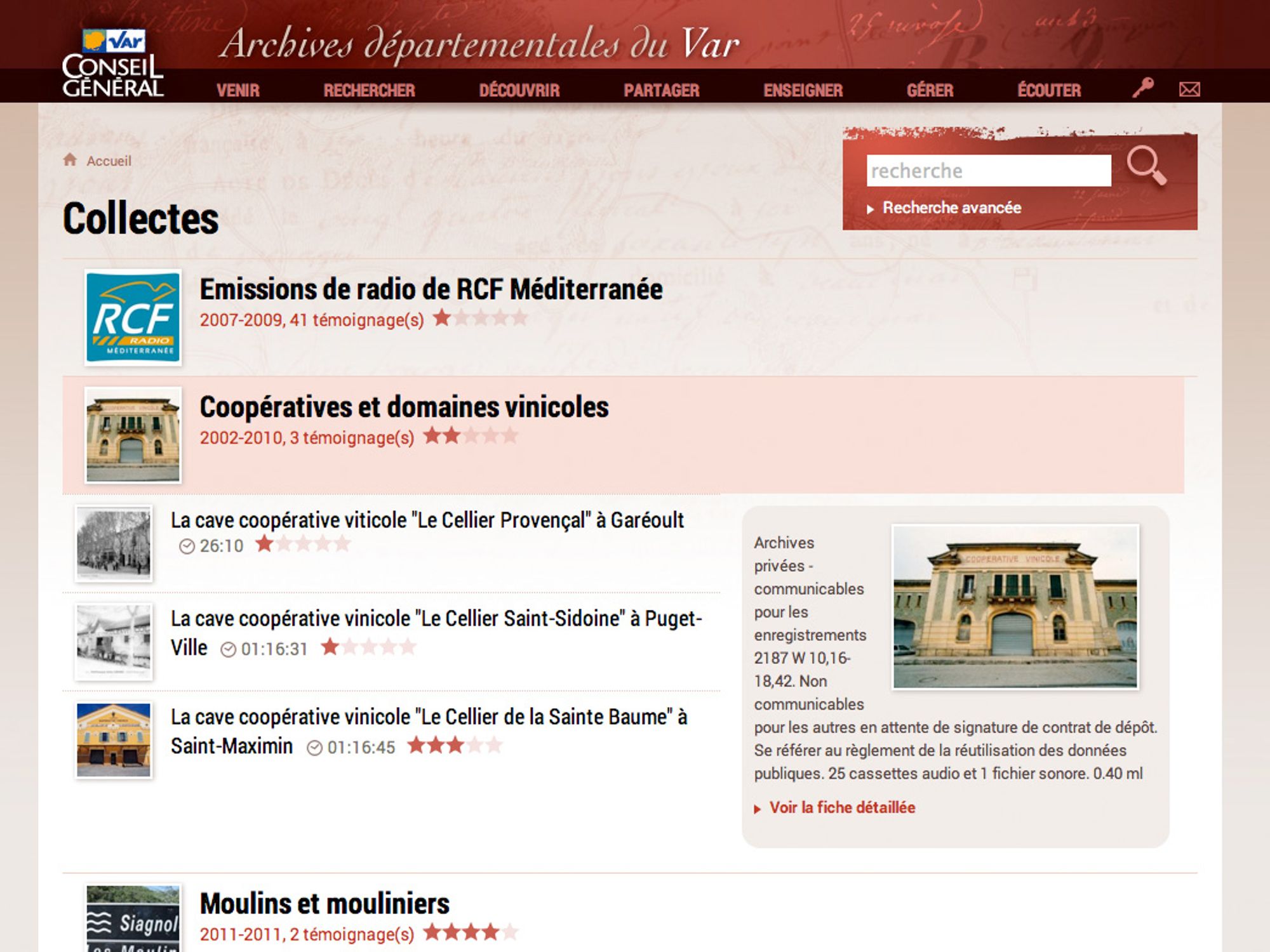 Le site memoire-orale.var.fr regroupe les fonds sonores communicables réalisés par les Archives départementales du Var ainsi que les fonds donnés, versés ou déposés par des particuliers (amateurs, érudits, chercheurs, ethnologues, historiens, …) et des organismes privés (radios locales, associations, entreprises, coopératives,…) et publics (Conseil général, communes, établissements publics).