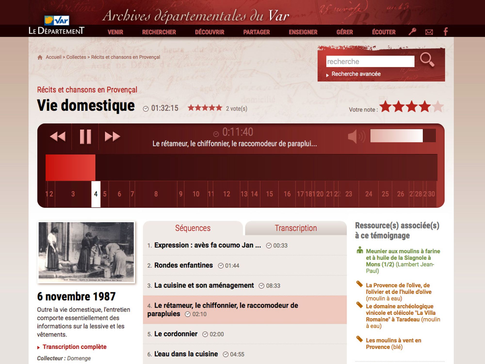 Nous avons le projet de mettre à la disposition des internautes des archives sonores produites par les Archives départementales du Var et regroupées sous l’intitulé « métiers d’autrefois ». Ce fonds regroupera les interviews d’un photographe, d’un trufficulteur, d’un moulinier, d’un producteur de narcisses, d’un cordonnier, d’un céramiste, etc.