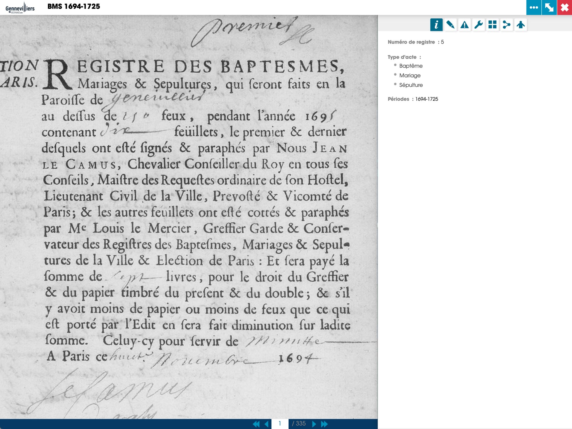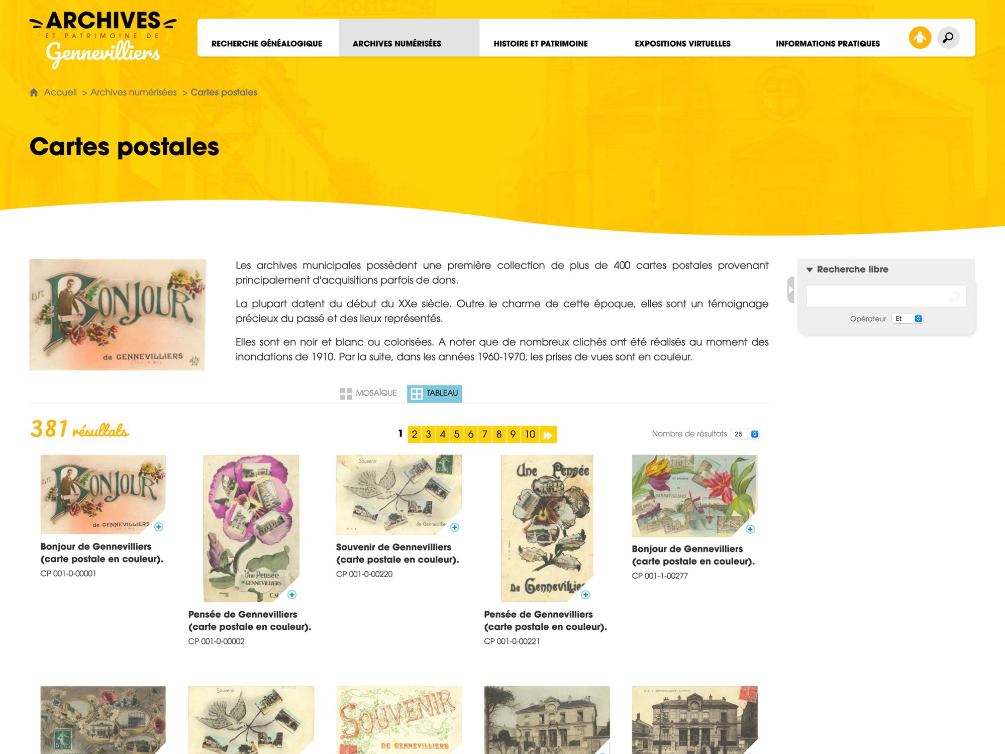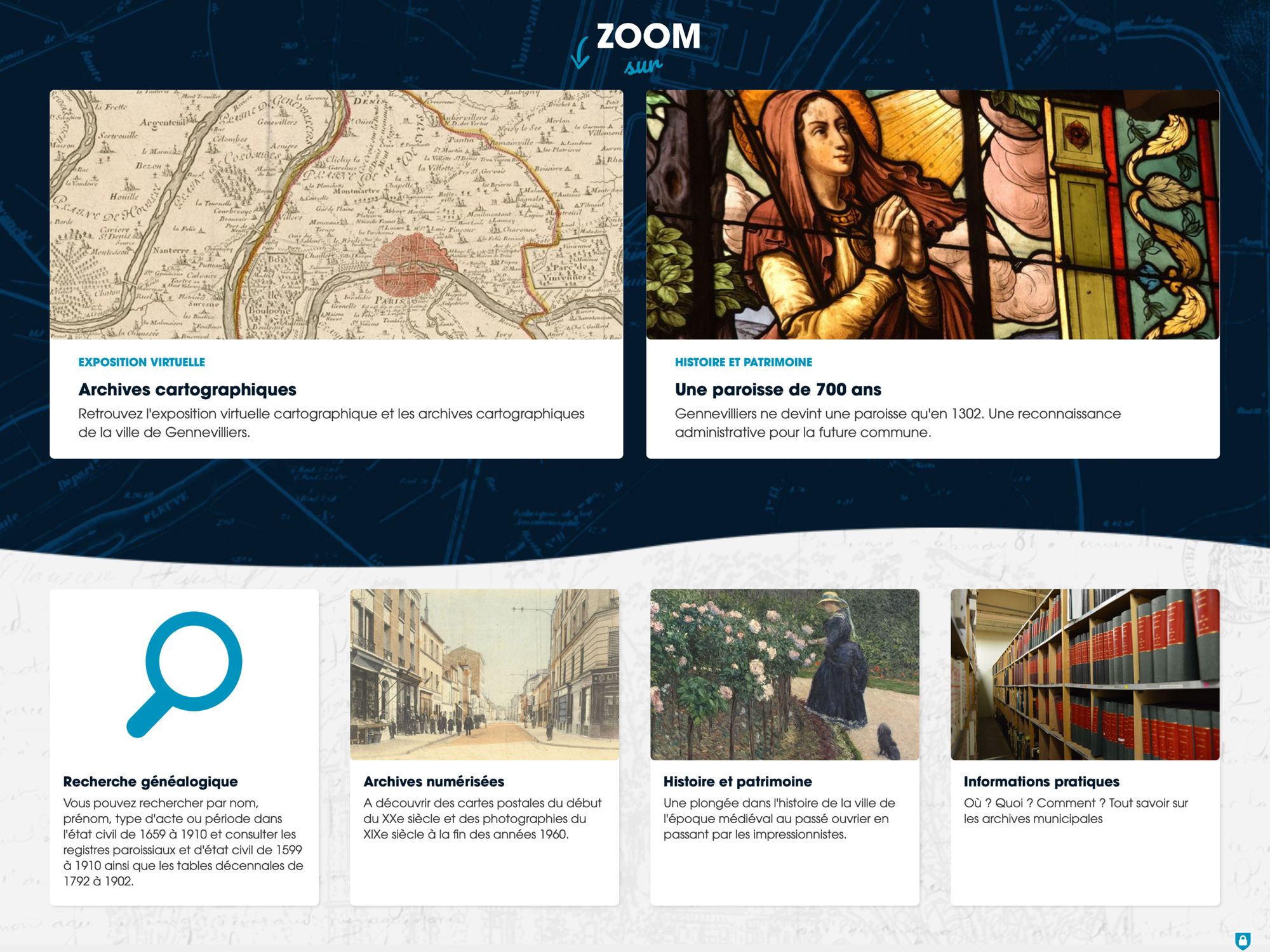 La recherche patronymique dans l’état civil de 1659 à 1910 est un véritable trésor historique rendu possible grâce au dépouillement méthodiques des actes des registres de l’état civil gennevillois. Autres trésors : un fonds de plus de 400 cartes postales du XXe siècle et 200 photos du XIXe siècle à la fin des années 1960 de Gennevilliers. Les internautes peuvent ainsi découvrir en photos l’ancien presbytère installé en 1900 ; la ville sous l’eau lors de la crue de la Seine en 1910 ou bien d’anciennes rues comme l’avenue de Paris qui est actuellement l’avenue Gabriel-Péri.