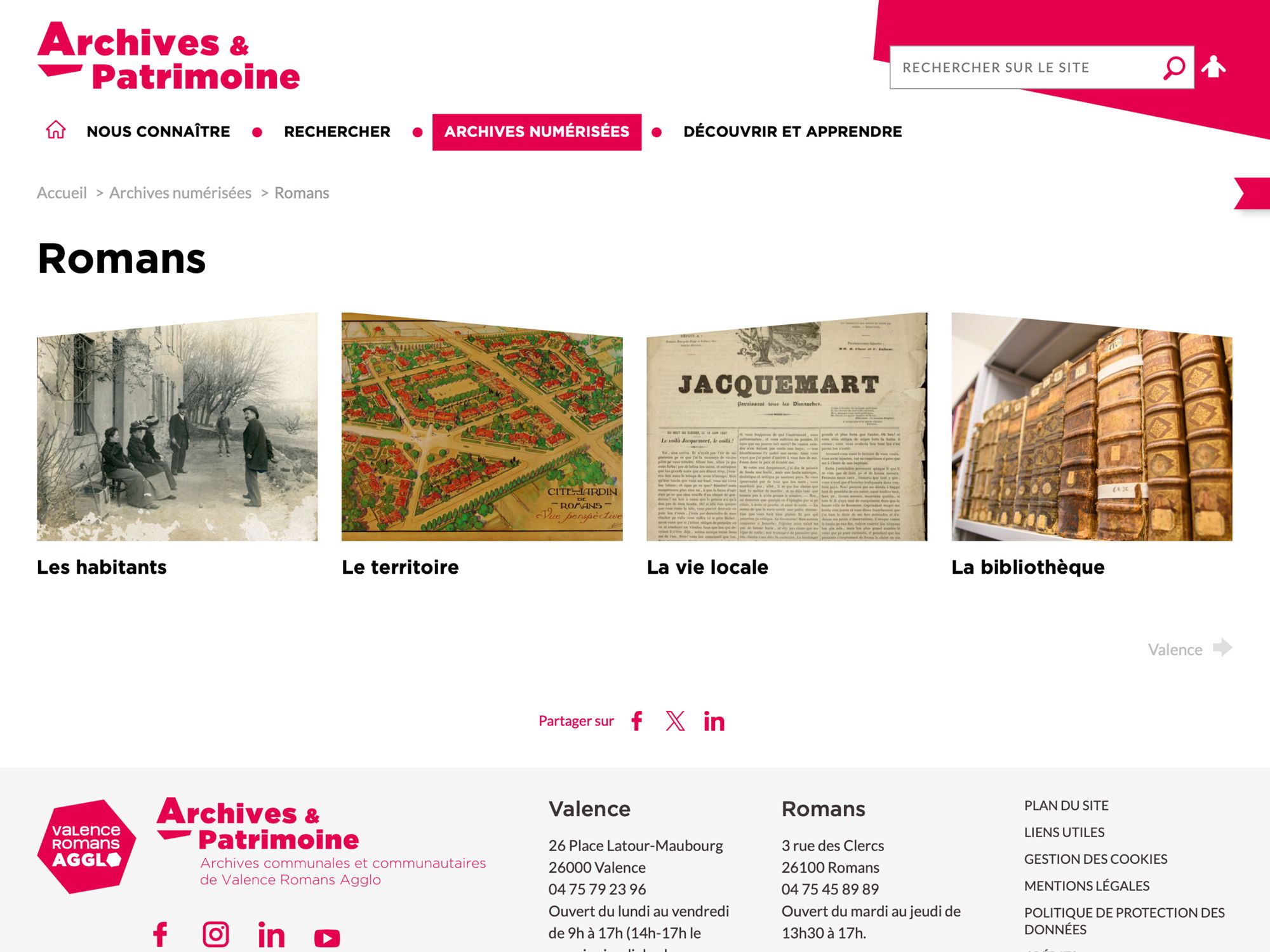 Le service Archives & Patrimoine est un service de Valence Romans Agglo. Il intervient au sein de cette communauté d'agglomération et de plusieurs communes et établissements publics de son territoire. Le service met en valeur les ressources des archives et du fonds patrimonial des médiathèques.