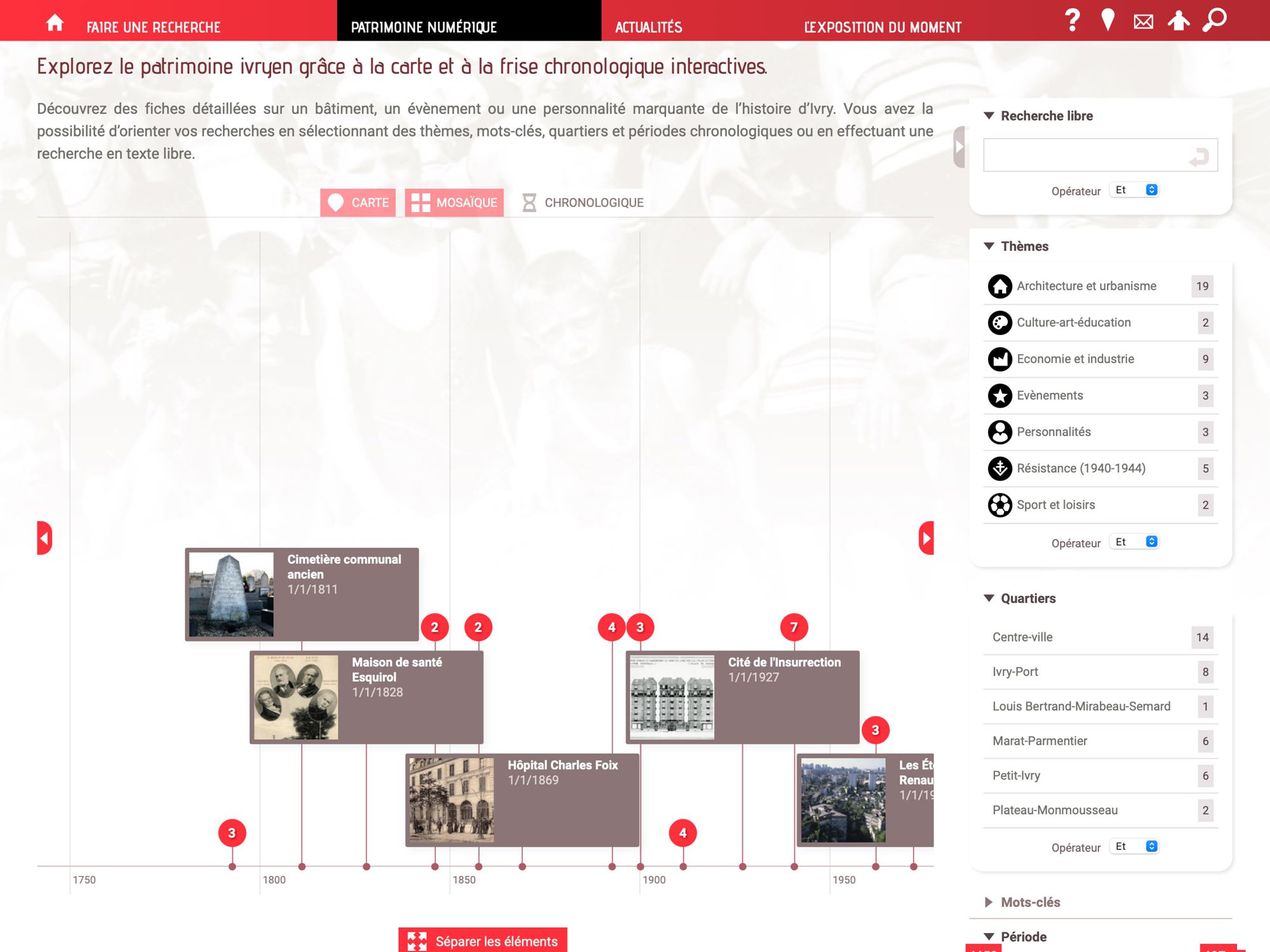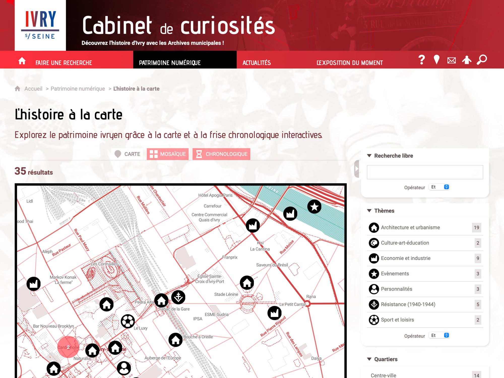 Ce site web a une double vocation. Il permet de prolonger la visite des expositions présentées dans le musée en proposant des contenus supplémentaires et des quizz afin de tester ses connaissances sur l’histoire d’Ivry. Mais il offre également, grâce à ses différents menus, un regard renouvelé sur le patrimoine ivryen ainsi qu’un accès inédit aux documents d’archives et aux travaux du service Archives-Patrimoine.