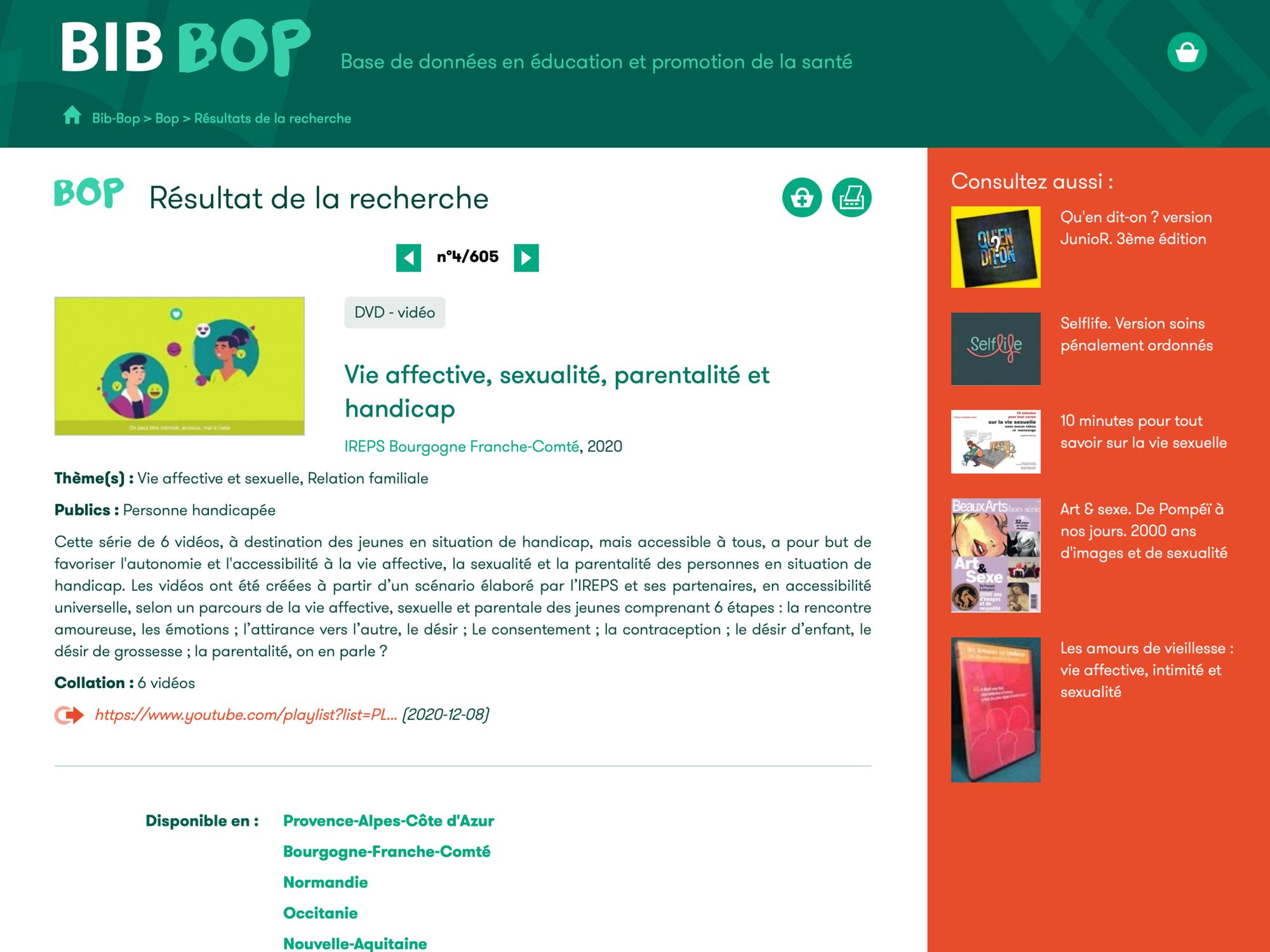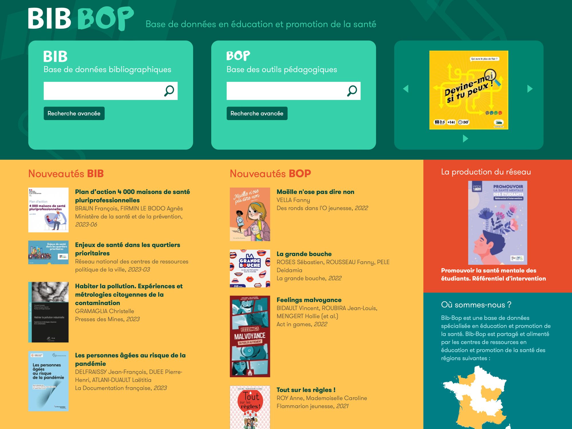 Bib-Bop est partagé et alimenté par les centres de ressources en éducation et promotion de la santé des régions suivantes : Champagne- Ardenne, Franche-Comté, Haute-Normandie, Languedoc-Roussillon, Midi-Pyrénées et Provence-Alpes-Côte d'Azur.