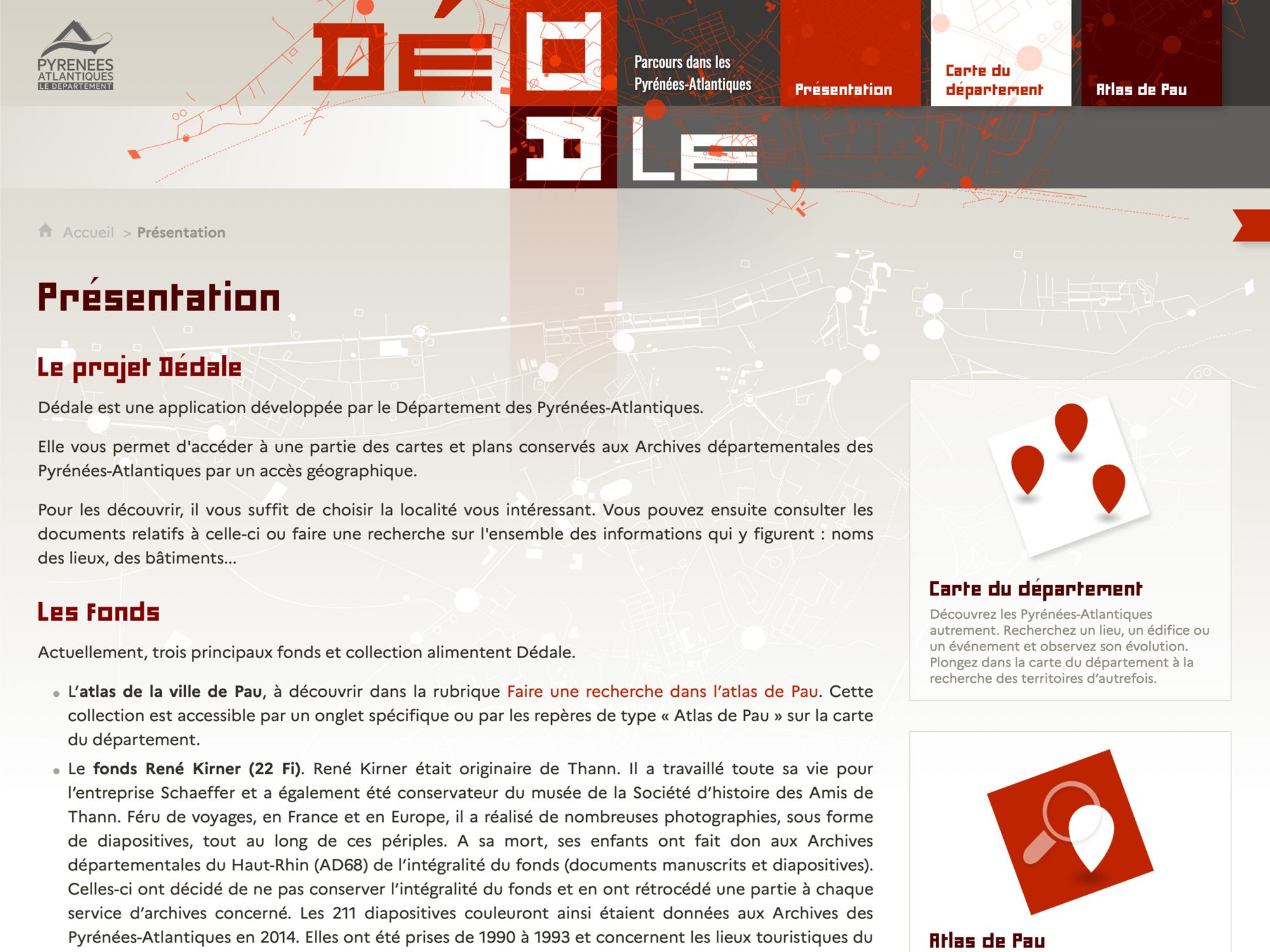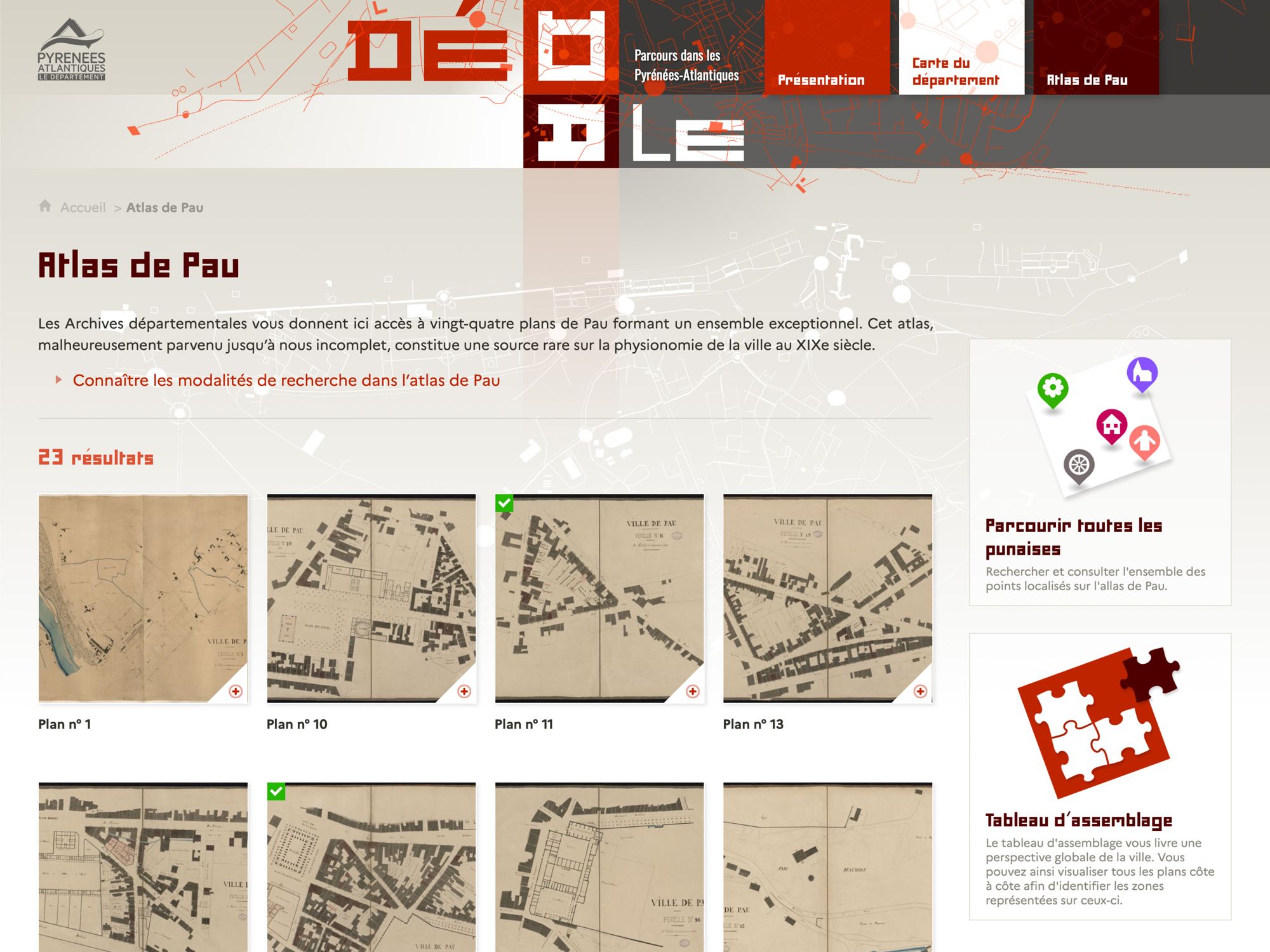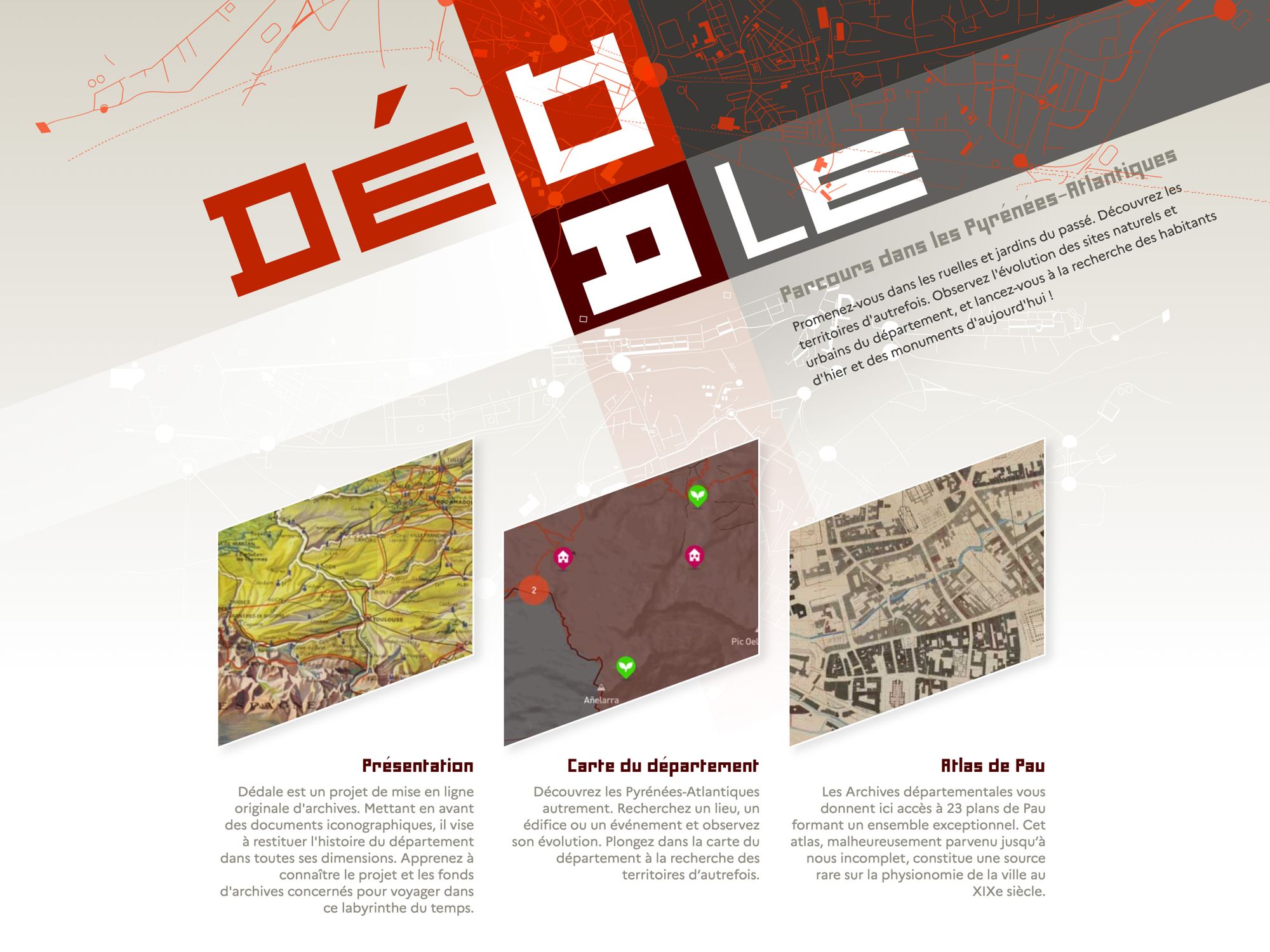 Dédale est né de la volonté de donner un accès innovant aux fonds iconographiques et cartographiques. Il ne s’agissait pas de remplacer notre accès par les instruments de recherche, mais d’offrir un nouvel angle de lecture de ces documents qui sont nativement explorés ainsi, par leur aspect visuel. Il nous semblait que la mise en perspective de documents, notamment photographiques par leur juxtaposition avec des cartes, offrait un éclairage puissant aux chercheurs. La volonté qui nous animait était donc de restituer une image du territoire dans toutes ses dimensions, spatiales et temporelles. Nous avons travaillé à une solution autorisant davantage le vagabondage et utilisé pour nourrir notre réflexion un remarquable atlas de plans de la ville de Pau dans la seconde moitié du XIXe siècle.