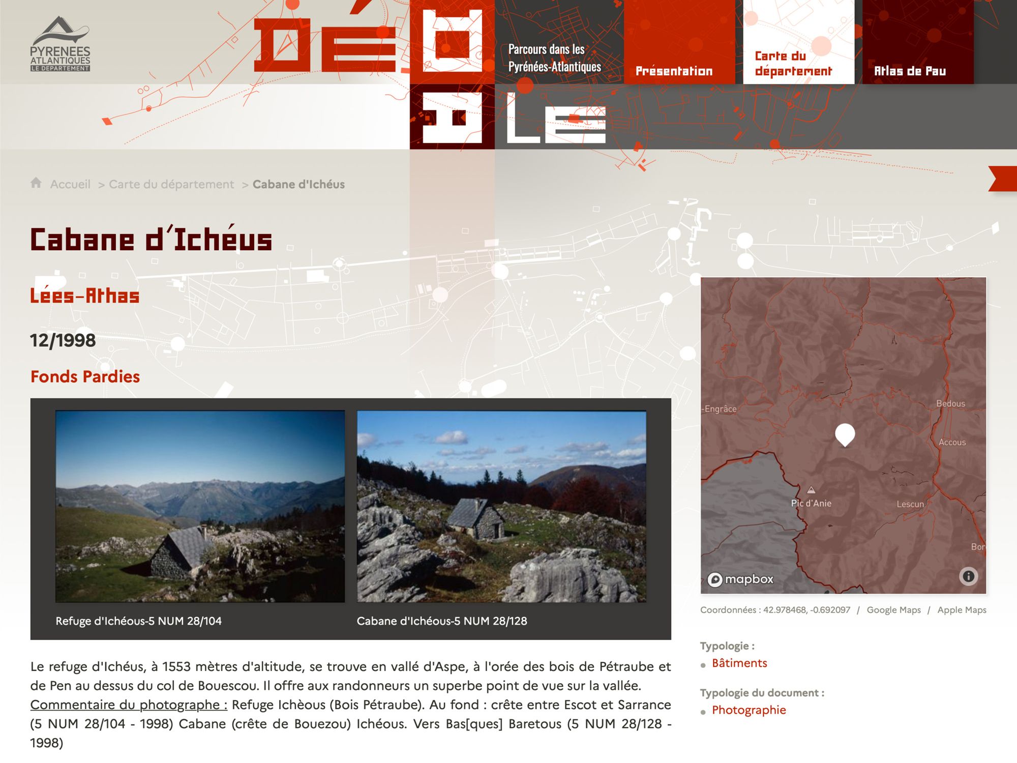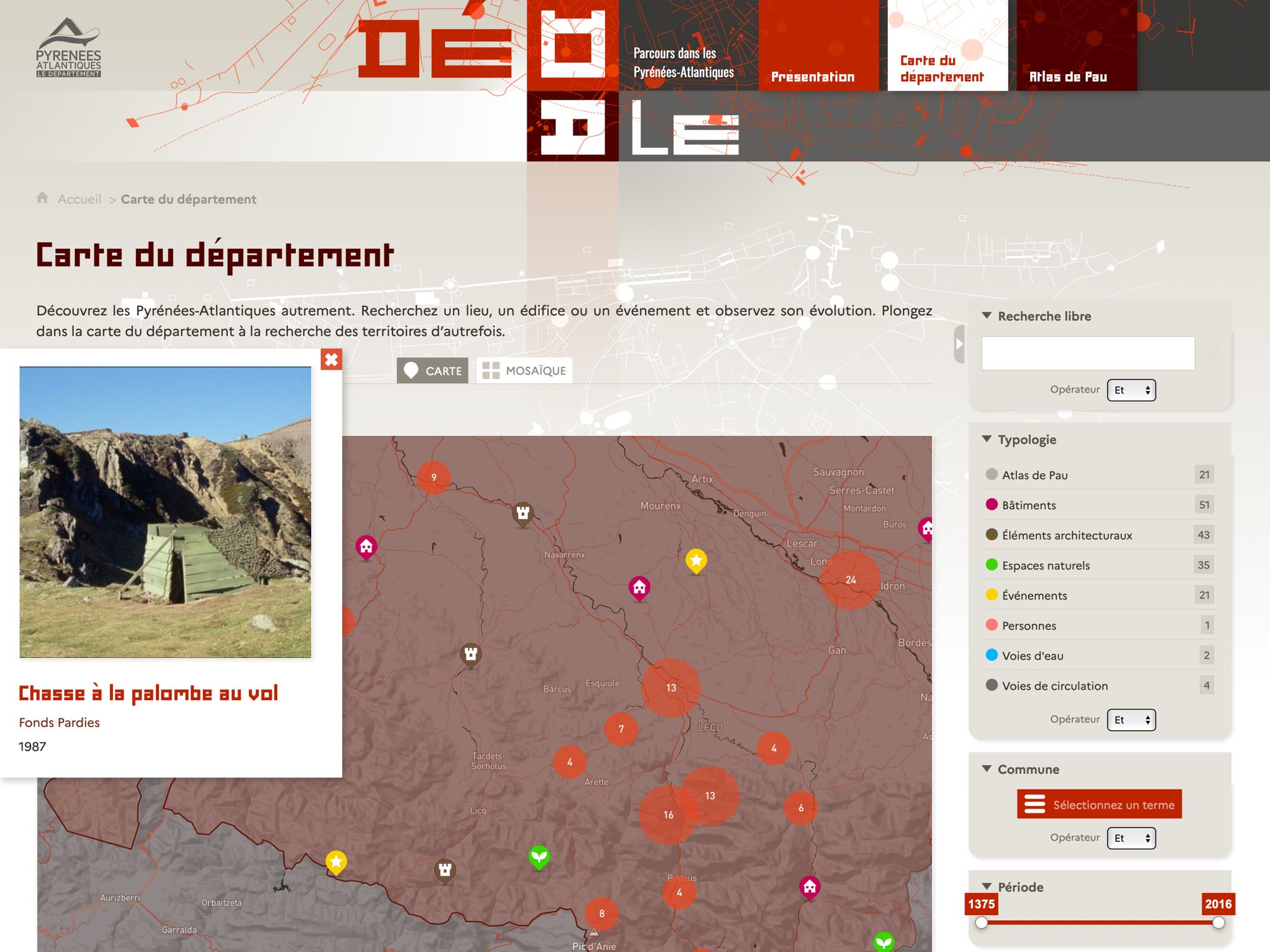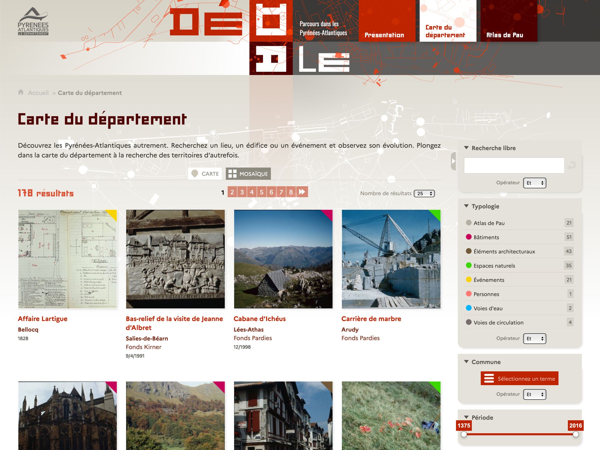 Dédale est né de la volonté de donner un accès innovant aux fonds iconographiques et cartographiques. Il ne s’agissait pas de remplacer notre accès par les instruments de recherche, mais d’offrir un nouvel angle de lecture de ces documents qui sont nativement explorés ainsi, par leur aspect visuel. Il nous semblait que la mise en perspective de documents, notamment photographiques par leur juxtaposition avec des cartes, offrait un éclairage puissant aux chercheurs. La volonté qui nous animait était donc de restituer une image du territoire dans toutes ses dimensions, spatiales et temporelles. Nous avons travaillé à une solution autorisant davantage le vagabondage et utilisé pour nourrir notre réflexion un remarquable atlas de plans de la ville de Pau dans la seconde moitié du XIXe siècle.