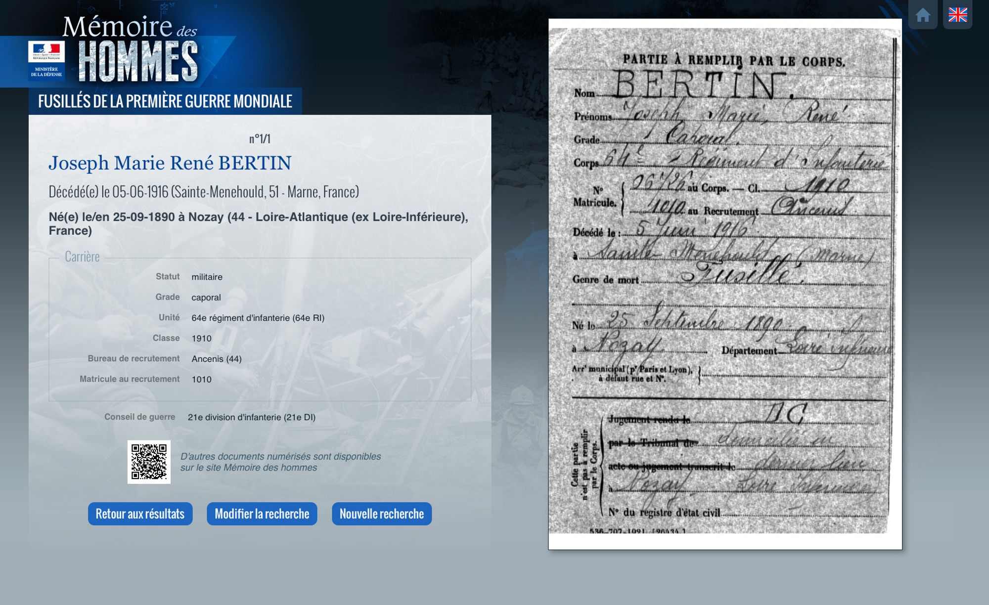 Si la recherche nominative nous paraissait un mode interactif rapide et efficace pour les visiteurs, donner à visionner l’ensemble des minutes de jugement et dossiers de procédure nous semblait en revanche contre-productif dans un parcours en station debout. Aussi, avons-nous fait le choix de limiter la consultation pour chaque soldat aux éléments synthétiques et à l’affichage de sa fiche de décès. Mais au regard, nous avons opté pour un QR code renvoyant vers le site et en précisant que d’autres informations étaient disponibles.