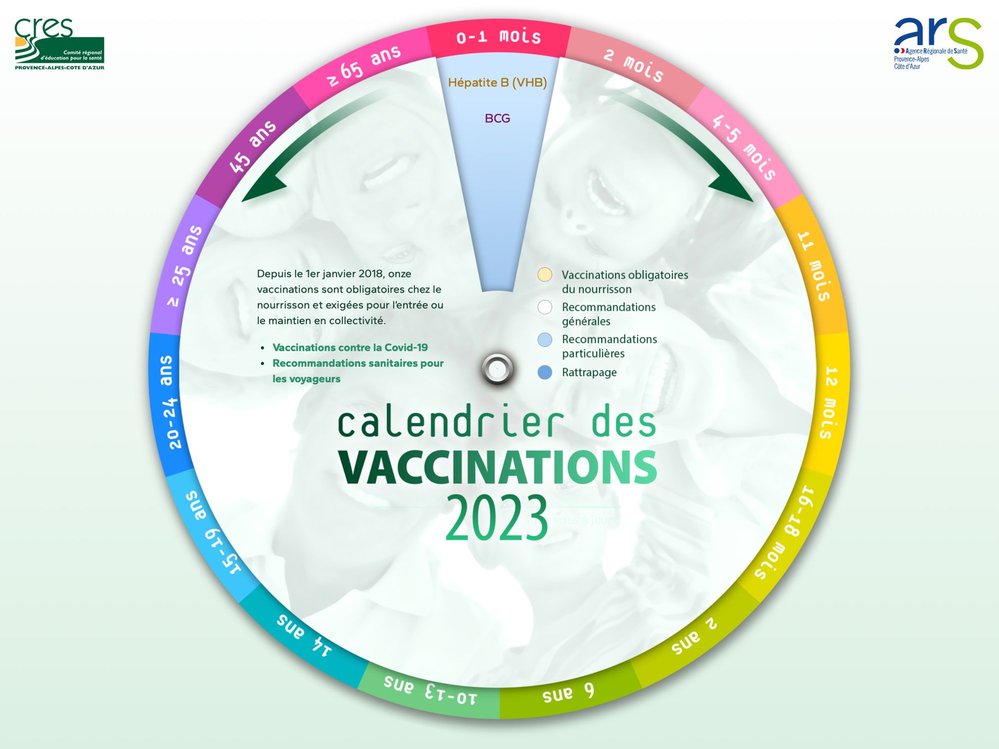 Pour promouvoir les recommandations du calendrier vaccinal, le CRES PACA réalise chaque année ce disque vaccinal qui permet, en cliquant sur une tranche d’âge, de visualiser les vaccins à faire ou à mettre à jour.